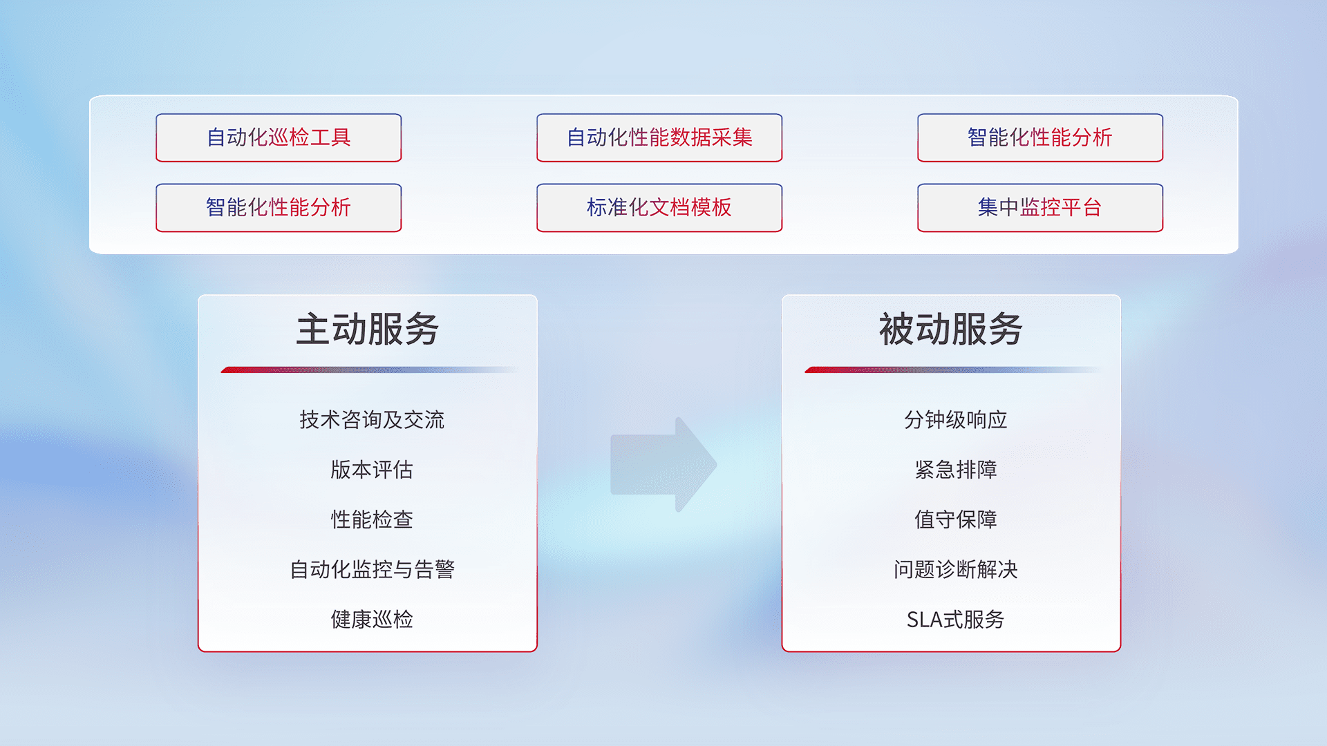 智能化工具和标准化文档,,保障服务质量,,提供主动服务(包含技术咨询、、、版本评估、、、、性能检查、、自动化监控与告警、、健康巡检)和被动服务包含(分钟级响应、、紧急排障、、、、值守保障、、问题诊断解决、、、SLA服务)。。。